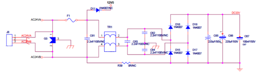2: 針對(duì)此AC24V電源方案,由于其采用了DC-DC芯片轉(zhuǎn)換,所以整流橋負(fù)極性的地與后極數(shù)字地是必須相連的,這與FlyBack電路不同,所以其防護(hù)設(shè)計(jì)需要特別考慮從數(shù)字地通過(guò)整流橋到接口的路徑。