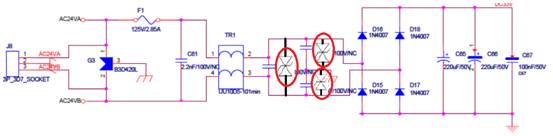 更改電路,由于原PCB空間限制,實(shí)際電路選用了檳城BV-SMBJ58C2H,SMB封裝,功率達(dá)到3000W,相當(dāng)于BV-SMDJ58CA。測(cè)試?yán)讚鬉C24V電源口AC24VA測(cè)試通過(guò),AC24VB測(cè)試后設(shè)備損壞,詳細(xì)檢查電路后發(fā)現(xiàn)整流橋二極管燒毀。
