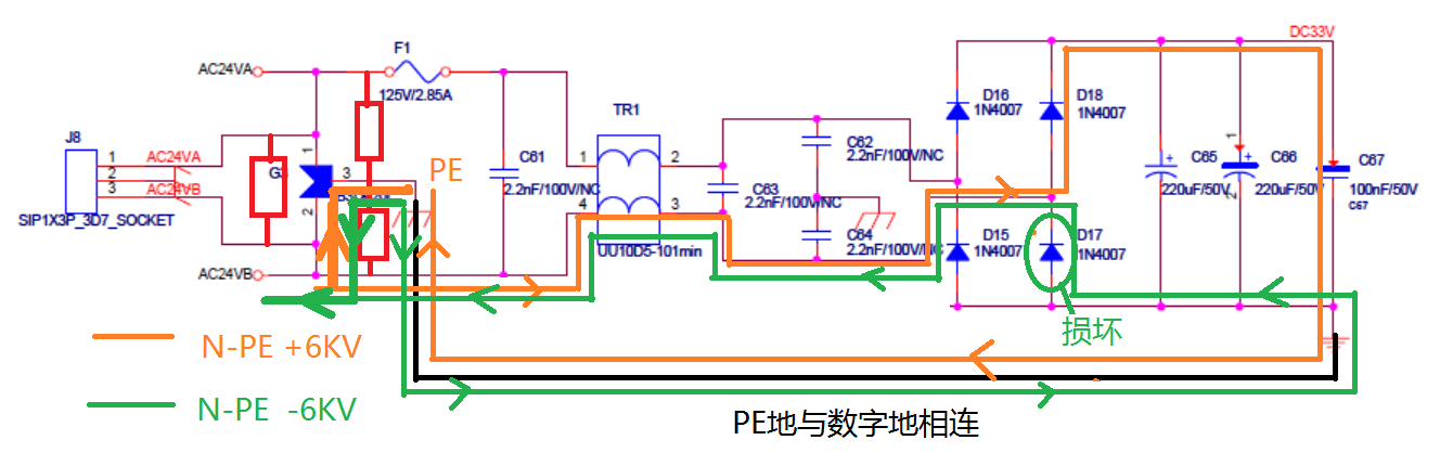 如上圖黃色所示為N-PE +6KV測(cè)試時(shí)的能量流經(jīng)圖,大能量從AV24VB開(kāi)始大部分通過(guò)TVS管泄放到地,另一部分能量通過(guò)后極整流橋D18通過(guò)DC33V與地的電容流經(jīng),由于電容隔離在,因此后極泄放的能量很小,不至于把整流橋搞壞。測(cè)試結(jié)果為通過(guò)。