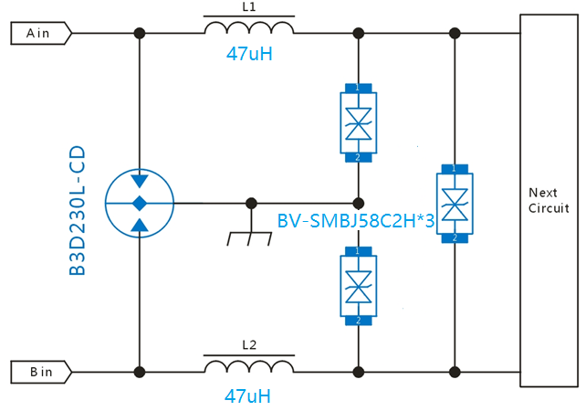 共模電感后極增加TVS管做二級(jí)保護(hù),TVS選型可以用BV-SMCJ58CA,BV-SMDJ58CA,BV-5SMDJ58CA,實(shí)際選用功率大小與PTC、共模電感退耦有關(guān)系。